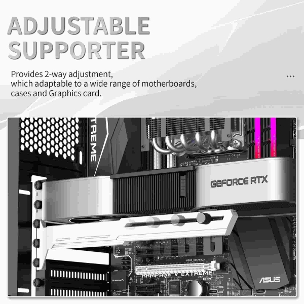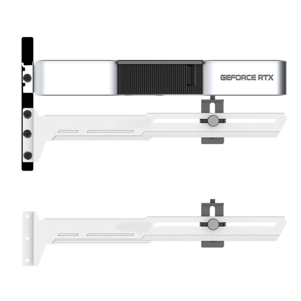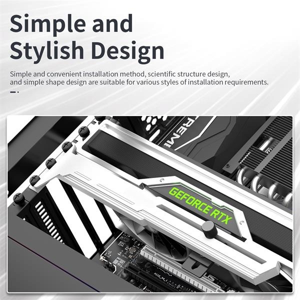 Stylová varianta této opory Vaší grafické karty je vyrobena z ocelového práškově lakovaného plechu a plastu, zabraňuje prohýbání větších karet ve slotu a dodává tak sestavě lepší celkovou stabilitu. Součástí je silikonová posuvná opora, kterou lze posunout jak horizontálně tak i vertikálně a umožňuje instalaci v různých místech karty, pro maximální kompatibilitu s většinou karet. Rozměry držáku jsou 280 x 52mm.