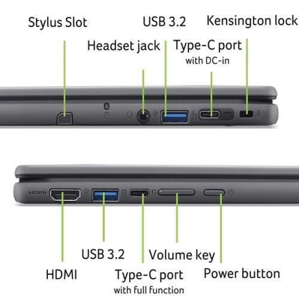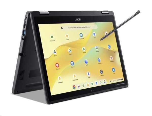 Acer Chromebook Spin 512 (R857TN-TCO-C4LZ) * H1 TPM čip * armádní standard MIL-STD 810H * certifikace TCO Operační systém: Chrome OS s Chrome Education Upgrade Procesor: Intel N-series N150 (4 jádra, 4 vlákna, 3,6 GHz, 6 MB cache) Paměť: 8GB LPDDR5x na desce Pevný disk: eMMC 128GB Optická mechanika: ne Čtečka paměťových karet: microSD Displej: dotykový 12,2'' WUXGA (1920x1200) 16:10 lesklý IPS (Corning® Gorilla® Glass s antibakteriální vrstvou s podporou USI 2.0 Active pen) Grafická karta: Intel UHD Graphics 24EU Audio: stereo, 2x mikrofon Web kamera: HD USB + 8MP MIPI Auto Focus Čtečka otisku prstů: ne Polohovací zařízení: OceanGlass™ Touchpad Klávesnice: bez numerického bloku Pero: Acer Active Síť: ne Bezdrátová komunikace: WLAN + Bluetooth (Wifi 6E Intel AX211 2X2 CNVi + BT 5.3) Porty USB: * 2x USB 3.2 Gen1 * 2x USB typ C™: USB 3.2 Gen1 (až 5Gb/s/DisplayPort přes USB-C/USB nabíjení 5/9/15/20V, 3A/DC-in 20V, 45W) Další porty: * 1x HDMI 1.4 * 1x kombinovaný konektor pro sluchátka/mikrofon (3,5mm) * 1x bezpečnostní slot Kensington Baterie: 53Wh Li-ion, 3článková Napájení: 65W USB-C AC adaptér Barva: černá Rozměry: 294x215x19,5/20,7mm Hmotnost: 1,5kg Záruka: 2 roky
