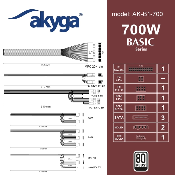 Akyga ATX Zdroj 700W Basic ventilátor 120mm P8 5xSATA PCI-E