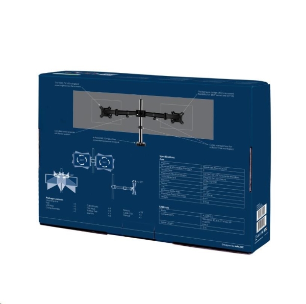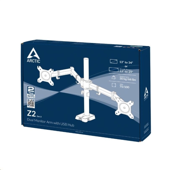 Arctic Z2 je flexibilní držák monitoru s dvěma rameny a USB hubem navržen tak, aby mohla být maximálně využita plocha pracovního stolu a LCD monitory nepřekážely. Ramena lze natáčet ve třech úrovních a rozsahu 360 stupňů pro dosažení maximální ergonomie.