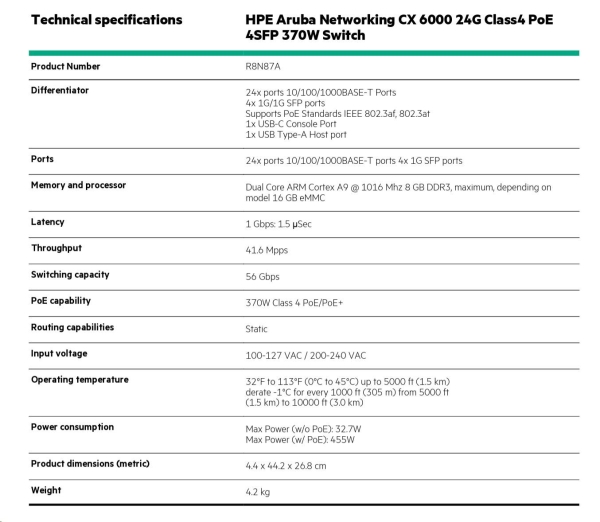 Aruba 6000 48G Class4 PoE 4SFP 370W Switch (R8N85A) |