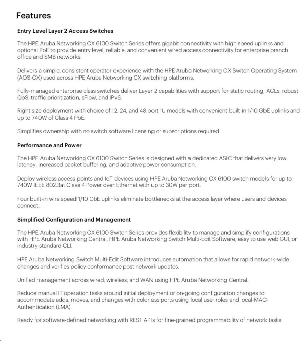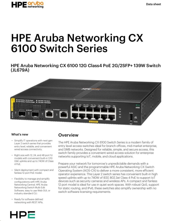 Aruba 6100 12G Class4 PoE 2G/2SFP+ 139W Switch JL679A RENEW