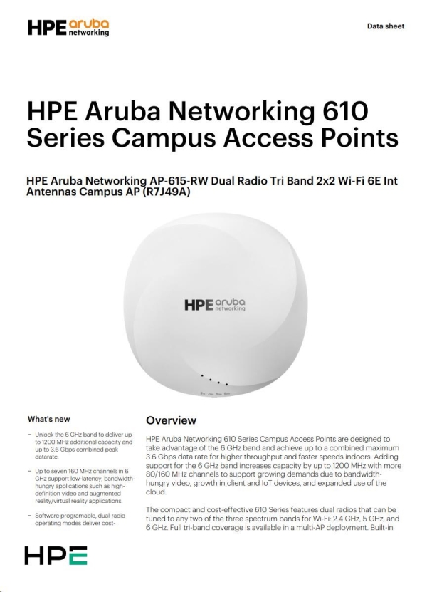 Summary Aruba 610 Series Access Points are designed to take advantage of the 6 GHz band using two radios that can deliver comprehensive tri-band coverage in a multi-AP environment and better meet the growing demands of Wi-Fi due to increased use of video, growth in client and IoT devices, and expanded use of cloud. With a 3.6 Gbps combined peak data rate for higher throughput and faster speeds for indoor use, the Aruba 610 Series delivers a cost-effective enterprise Wi-Fi 6E solution with increased capacity, wider channels, reduced power consumption. |