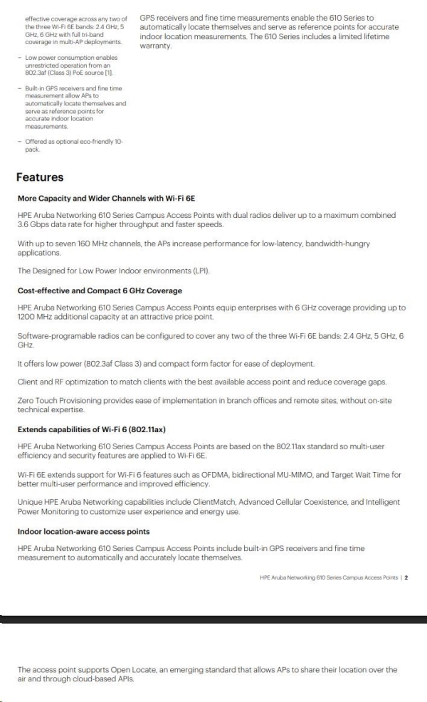 Wi-Fi Optimization Client Optimization Aruba's patented AI-powered technology eliminates sticky client issues by steering a client to the AP where it receives the best radio signal. ClientMatch steers traffic from the noisy 2.4 GHz band to the preferred 5 GHz or 6 GHz band depending on client capabilities and AP setttings. ClientMatch also dynamically steers traffic to load balance APs to improve the user experience. Automated Wi-Fi Radio Frequency Management To optimize the user experience and provide greater stability, Aruba AirMatch allows organizations to automate network optimization using machine learning. AirMatch provides dynamic bandwidth adjustments to support changing device density, enhanced roaming using an even distribution of Effective Isotropic Radiated Power (EIRP) to radios, and real-time channel assignments to mitigate co-channel interference. AirMatch also ensures that the two radios of Aruba 610 Series Access Points are automatically configured in the most effective and efficient way to deliver full tri-band coverage. Application Assurance With Aruba Air Slice, organizations can provide application assurance to their users that goes beyond the traditional capabilities of airtime fairness. After the SLAs are configured, Air Slice monitors network usage, automatically allocates radio resources, and dynamically adjusts radio resources as new users connect and applications sessions begin or end. Aruba Advanced Cellular Coexistence (ACC) Unique to Aruba, Advanced Cellular Coexistence uses built-in filtering to automatically minimize the impact of interference from cellular networks, distributed antenna systems (DAS), and commercial small cell or femtocell equipment. Intelligent Power Monitoring (IPM) For better insights into energy consumption, Aruba APs continuously monitor and report hardware energy usage. Unlike other vendor's access points, Aruba APs can also be configured to enable or disable capabilities based on available PoE power - ideal when wired switches have exhausted their power budget. Enterprises can deploy Wi-Fi 6E APs and update switching and power at a later if needed based on their actual usage. Self-Locating APs Indoor location shouldn't require guesswork or costly overlay technologies. Aruba's Wi-Fi 6 and 6E APs help organizations leverage their wireless investment to deliver indoor location - everywhere. Aruba 610 Series Campus APs include built-in GPS receivers and intelligent software to allow them to automatically locate themselves accurately within the universal framework of latitude and longitude. As part of Aruba's indoor location services solution, they serve as reference points for client devices using fine time measurements (802.11mc) and other location technologies. In addition, Aruba's Wi-Fi 6 and 6E APs support Open Locate, an emerging standard that allows APs to share their location over the air and through cloud-based APIs, enabling mobile devices to locate themselves and applications to support network analytics. APs as an IoT transport platform The Aruba 610 Series includes an integrated Bluetooth 5 and 802.15.4 radio for Zigbee support to simplify deploying and managing IoT-based location services, asset tracking services, security solutions, and IoT sensors. There is also a USB-port extension to provide IoT connectivity to a wider range of devices. These IoT capabilities allows organizations to leverage Aruba APs as an IoT transport platform, which eliminates the need for an overlay infrastructure and additional IT resources and can accelerate IoT initiatives. In addition, Target Wake Time (TWT), part of the 802.11ax standard, establishes a schedule for when clients need to communicate with an AP. This helps improve client power savings and reduces airtime contention with other clients, which is ideal for IoT. Aruba secure infrastructure The Aruba 610 Series includes build-security capabilities such as: