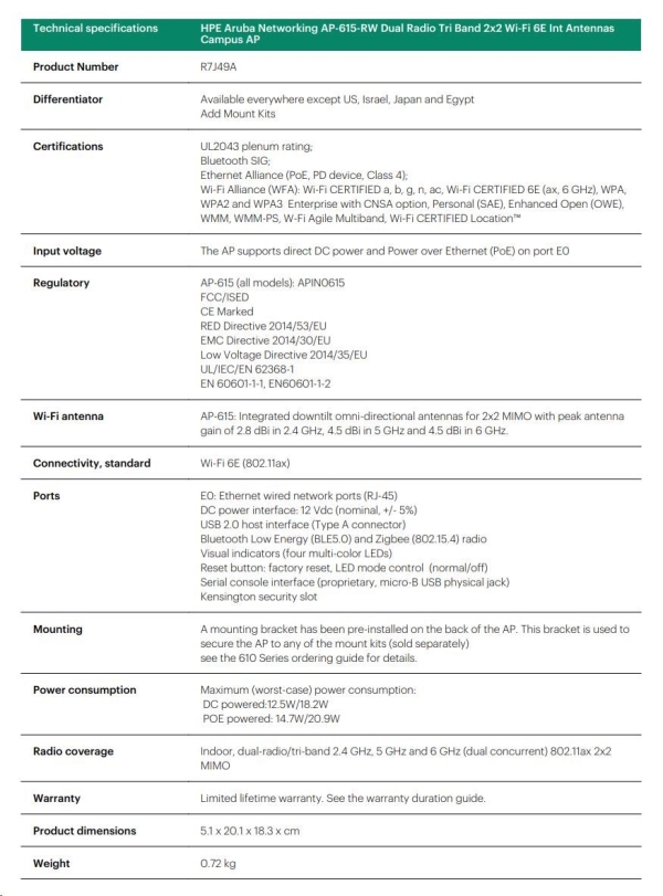 Aruba AP-615 (US) TAA Dual-radio Tri-band 2x2:2 802.11ax Wi-Fi 6E Internal Antennas Campus AP |