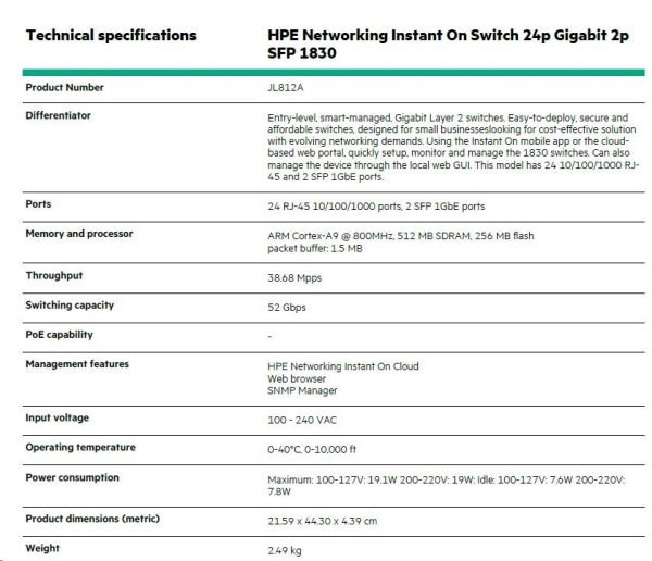 Aruba Instant On 1830 24G 10/100/1000 2SFP Switch. JL812A