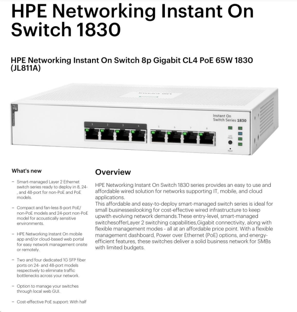 Aruba Instant On 1830 8G 4p Class4 PoE 65W Switch (JL811A) |