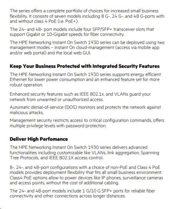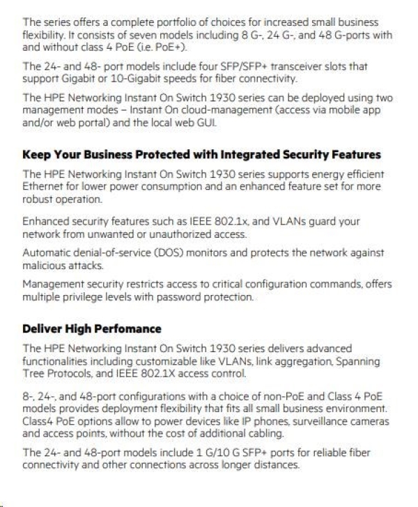 Řada přepínačů Aruba Instant On 1930 podporuje energeticky účinné Ethernet pro nižší spotřebu energie a rozšířenou sadu funkcí pro robustnější provoz. Automatické monitorování a ochrana sítě při odepření služby (DOS) proti škodlivým útokům. Zabezpečení správy omezuje přístup ke kritické konfiguraci příkazy, nabízí více úrovní oprávnění s ochranou heslem.