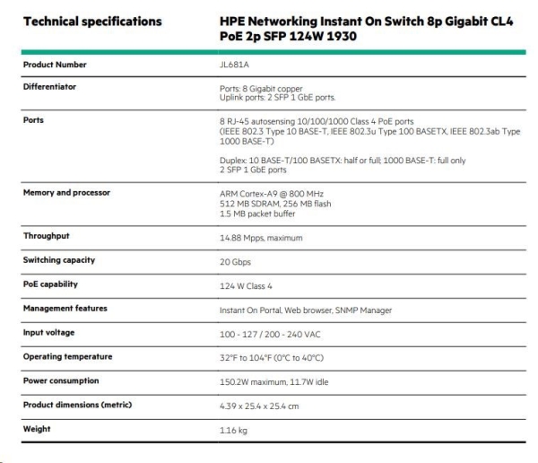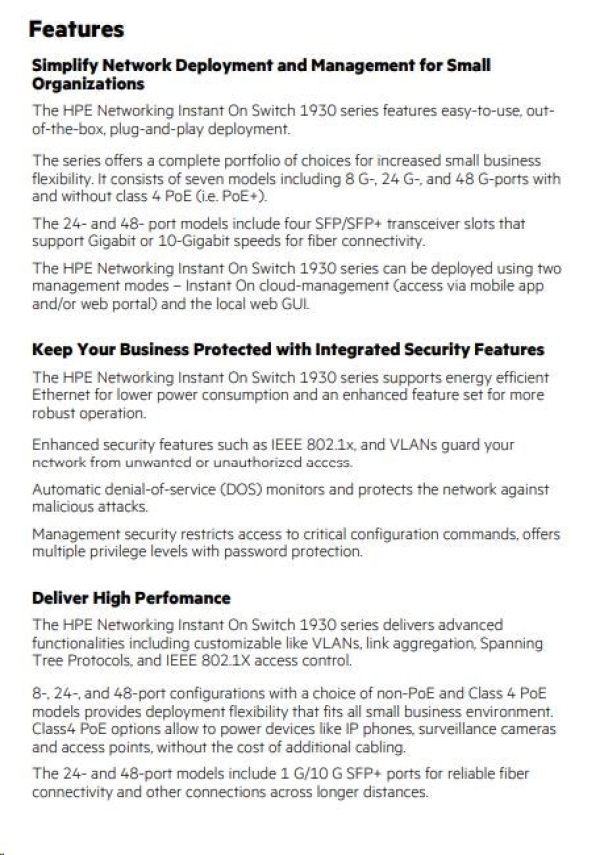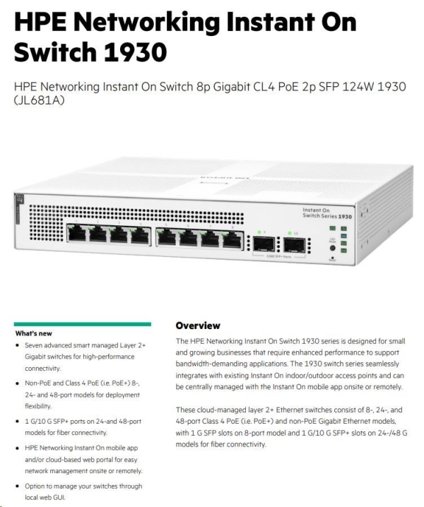 Whether you own a cafe, a design firm or a tech startup, a reliable and secure network plays a critical role in the success of your business. And you need a network solution that gives you peace of mind, allowing you to focus on growing your business instead of managing problems with your network. Aruba Instant On makes it easy to keep network users happy, mobile and IoT devices connected, and your network secure. The Aruba Instant On 1930 switches features advanced, smart-managed, fixed- configuration Gigabit switches designed for small businesses that are easy-to-deploy and affordable. They're made to handle today's bandwidth-heavy applications like voice and video conferencing, enabling consistent connectivity to enhance performance. Using either the Instant On mobile app or the cloud-based web portal, you can quickly set up, monitor and manage the 1930 switch series from anywhere at any time. What's more, up to 30 W PoE power delivery is available out-of-the-box for your class 4 PoE devices, like access points, surveillance cameras and VoIP phones, all easily managed from the same platform. Built-in security features protect your network from unauthorized access by allowing you to segment traffic and define access to each area of the network. And all of this is included in the price of the hardware - there are no hidden subscription or licensing fees.