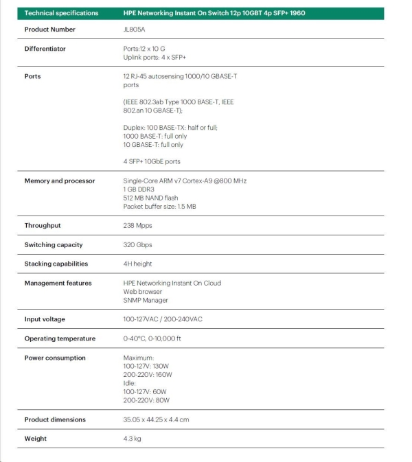 Aruba Instant On 1960 12XGT 4SFP+ Switch (12RJ45 100/1000/10GBASE-T 4SFP+ fixed 1000/10000 SFP+)