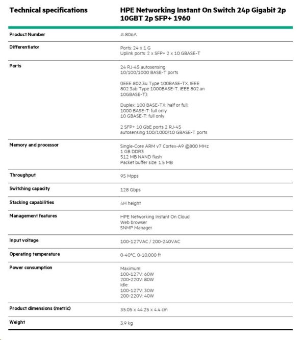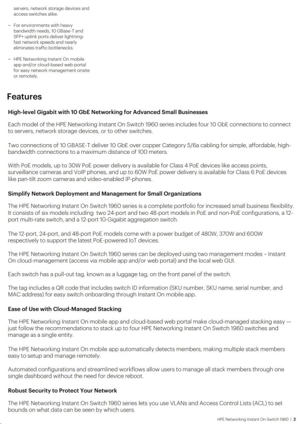 In today's digital-first environment, small businesses face many challenges to stay afloat and competitive. With tight budgets and limited technical expertise, they're struggling to keep up with the explosion of devices and bandwidth-heavy applications running on the network. To optimize both performance and investment, small businesses need cost-effective, next-gen networking solutions. The Aruba Instant On 1960 Switch Series is an easy-to-use and affordable wired solution for networks supporting IT, mobile and cloud applications. Aruba Instant On 1960 Switches are advanced, smart-managed, fixed configuration Gigabit stackable switches designed for small and growing businesses that are easy to deploy and affordable. These switches are designed to scale as business grows, making adding more employees, devices and applications simple. Aruba Instant On 1960 switches are made to handle today's bandwidth-heavy applications like voice and video conferencing, enabling consistent connectivity to improve user experience and application performance. |