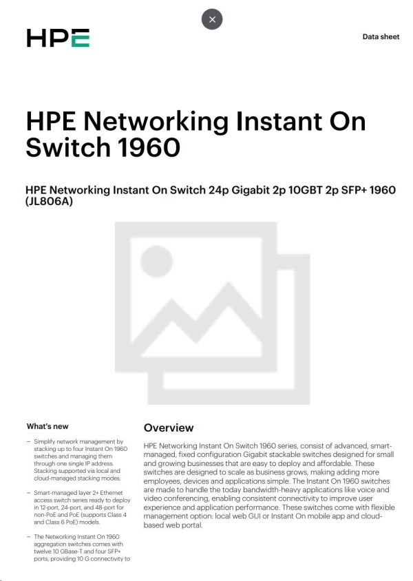 In today's digital-first environment, small businesses face many challenges to stay afloat and competitive. With tight budgets and limited technical expertise, they're struggling to keep up with the explosion of devices and bandwidth-heavy applications running on the network. To optimize both performance and investment, small businesses need cost-effective, next-gen networking solutions. The Aruba Instant On 1960 Switch Series is an easy-to-use and affordable wired solution for networks supporting IT, mobile and cloud applications. Aruba Instant On 1960 Switches are advanced, smart-managed, fixed configuration Gigabit stackable switches designed for small and growing businesses that are easy to deploy and affordable. These switches are designed to scale as business grows, making adding more employees, devices and applications simple. Aruba Instant On 1960 switches are made to handle today's bandwidth-heavy applications like voice and video conferencing, enabling consistent connectivity to improve user experience and application performance.