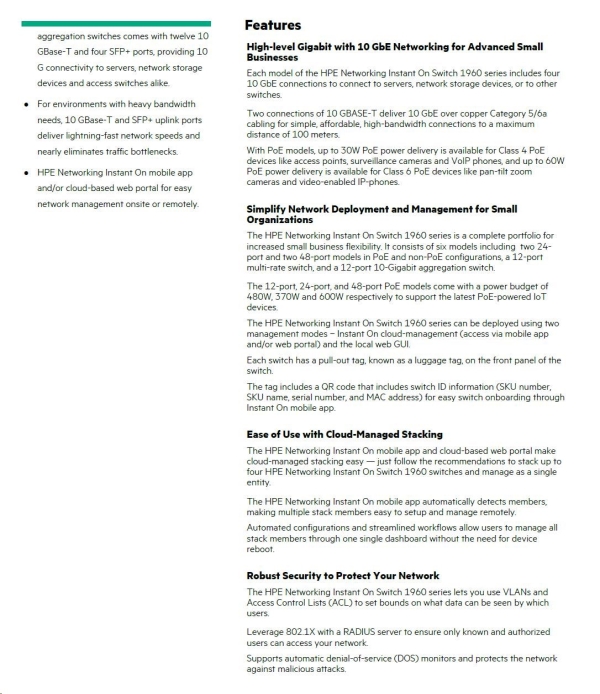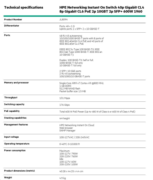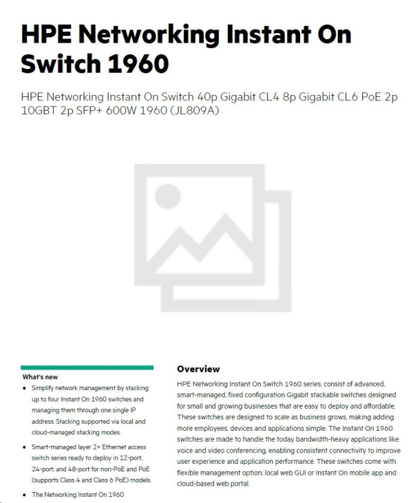 Aruba Instant On 1960 48G 40p Class4 8p Class6 PoE 2XGT 2SFP+ 600W Switch