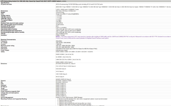 Notes1: 1 Acoustics measured in 23°C semi-anechoic chamber with a loading of 100% traffic and (for JL807A and JL809A) 50% PoE on all ports. Measured in accordance with ISO 7779. Declared in accordance with ECMA-109:2010. Values presented are the Declared A-Weighted Sound Power Level (LWAd) and the mean Bystander A-Weighted Sound Pressure Level (LpAm) |