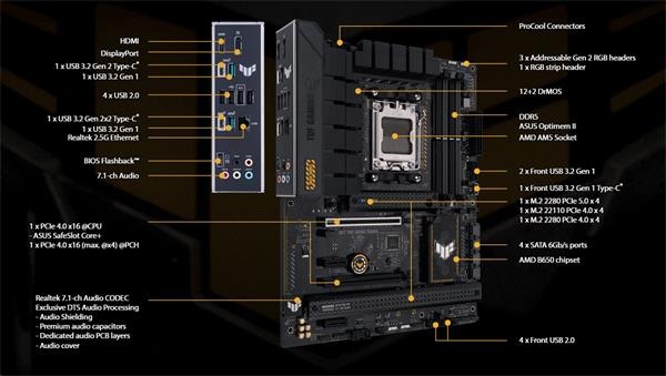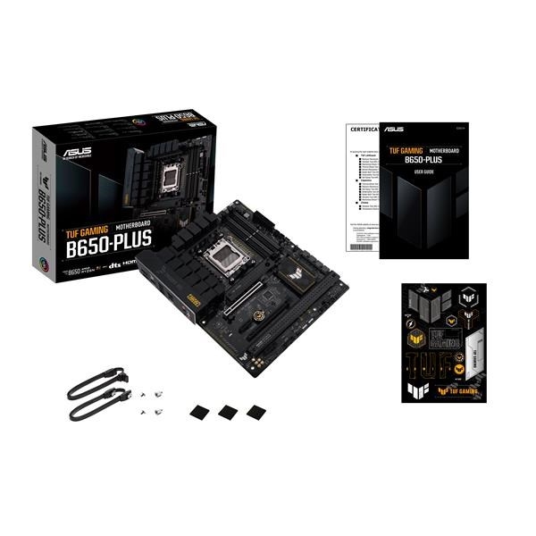 ASUS TUF GAMING B650-PLUS takes all the essential elements of the latest AMD Ryzen 7000-series processors and combines them with game-ready features and proven durability. Engineered with military-grade components, an upgraded power solution and a comprehensive cooling system, this motherboard goes beyond expectations with rock-solid and stable performance for marathon gaming. TUF GAMING motherboards also undergo rigorous endurance testing to ensure that they can handle conditions where others may fail. Aesthetically, this model incorporates rugged off-black and geometric design elements to reflect the dependability and stability that defines the TUF GAMING series.