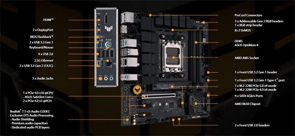 AASUS TUF GAMING B650M-E takes all the essential elements of the latest AMD Ryzen 7000-series processors and combines them with game-ready features and proven durability. Engineered with military-grade components, an upgraded power solution and a comprehensive cooling system, this motherboard goes beyond expectations with rock-solid and stable performance for marathon gaming. TUF GAMING motherboards also undergo rigorous endurance testing to ensure that they can handle conditions where others may fail. Aesthetically, this model incorporates rugged off-black and geometric design elements to reflect the dependability and stability that defines the TUF GAMING series.