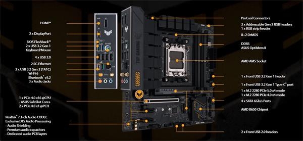 ASUS TUF GAMING B650M-E WIFI takes all the essential elements of the latest AMD Ryzen 7000-series processors and combines them with game-ready features and proven durability. Engineered with military-grade components, an upgraded power solution and a comprehensive cooling system, this motherboard goes beyond expectations with rock-solid and stable performance for marathon gaming. TUF GAMING motherboards also undergo rigorous endurance testing to ensure that they can handle conditions where others may fail. Aesthetically, this model incorporates rugged off-black and geometric design elements to reflect the dependability and stability that defines the TUF GAMING series.