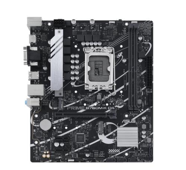 ASUS Prime B760M-K D4, an Intel B760 LGA 1700 mATX motherboard with PCIe 4.0, two PCIe 4.0 M.2 slots, DDR4, Realtek 2.5Gb Ethernet, VGA, HDMI, SATA 6 Gbps, front USB 3.2 Gen 1, Aura Sync