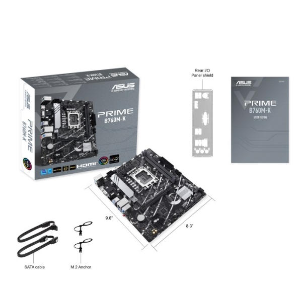 ASUS Prime B760M-K, an Intel B760 LGA 1700 mATX motherboard with PCIe 4.0, two PCIe 4.0 M.2 slots, DDR5, Realtek 2.5Gb Ethernet, VGA, HDMI™, SATA 6 Gbps, front USB 3.2 Gen 1, Aura Sync