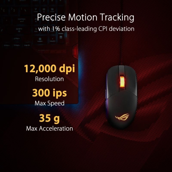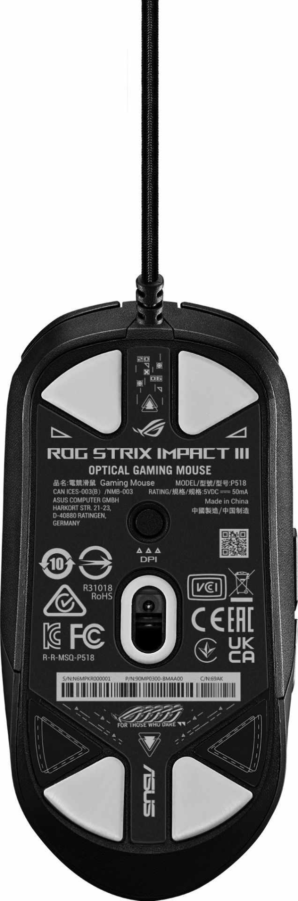 ASUS ROG Strix Impact III herní myš * podsvícené rolovací kolečko a logo * AURA Sync * software Armoury Crate Gear * extrémně pružný a lehký kabel ROG Paracord a 100% teflonové nožičky myši * změna DPI za chodu: funkce DPI On-The-Scroll umožňuje snadné úpravy přímo při hraní * ROG Micro-Switches: spínače ROG Micro nabízejí konzistentní sílu kliku a životnost až 70 milionů kliknutí Rozhraní: USB 2.0 Technologie snímání: optická (3311) Rozlišení: 100-12000DPI Rychlost: 300IPS Zrychlení: 35G Polling Rate (vzorkovací frekvence): 1000Hz Programovatelná tlačítka: 5 Délka kabelu: 2m Profily vestavěné paměti: 3 Barva: černá Rozměry: 126x62x39mm Hmotnost: 59g Obsah balení: * 1x herní myš ROG Impact III * 1x průvodce rychlým nastavením * 1x záruční list