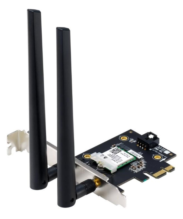 WiFi 6E PCI-E Adapter with 2 external antennas. Supporting 6GHz band, 160MHz, Bluetooth 5.2, WPA3 network security, OFDMA and MU-MIMO
