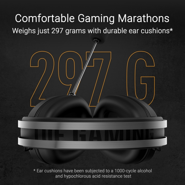 Drátová herní náhlavní souprava s 40mm měniči ASUS Essence, virtuální 7.1 prostorový zvuk, mikrofon s certifikací TeamSpeak, lehká 297gramová konstrukce, odolné náušníky a podsvícení symbolického loga TUF