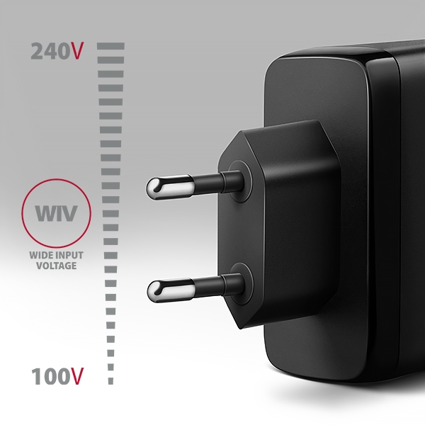 Cestovní nabíječka do sítě AXAGON ACU-DPQ100 GaN umožňuje rychlé nabíjení až tří mobilních zařízení současně. Díky celkovému výkonu 100W dokáže nabíječka dobíjet notebooky, telefony a další mobilní zařízení nejvyšší možnou rychlostí. Adaptér nabízí nejen standardní USB-A konektor, ale také dva oboustranné USB-C konektory. Kompaktní velikost a vysoký výkon je daný využitím nové GaN technologie. Použité součástky s Nitridem Galia pracují s vysokou účinností, což umožňuje dosahovat vysokých výkonů při malé velikosti. Nabíječka je vybavena dvěma výstupy Power Delivery 3.0 / Quick Charge 4+ USB typu C a jeden Quick Charge 3.0 USB typu A, což umožňuje rychlé nabíjení nejen smartphonů a tabletů, ale také notebooků. Technologie Quick Charge 4+ umožňuje až 4x rychlejší nabíjení telefonů než běžná USB nabíječka. Technologie Power Delivery 3.0 nejenže podporuje nabíjení moderních telefonů, ale také umožňuje 100W PD nabíjení výkonných notebooků. Nabíječka podporuje 20W PD nabíjení pro iPhone 12, 13, 14 a 15 a nabízí také 27W PD nabíjení pro iPhone 13 Pro, 14 Pro, 15 Pro a jejich modely Pro Max. Kromě toho podporuje 25W SFC nabíjení pro Samsung Galaxy S20 - S24, Note a Z Fold series a také nabízí 45W SFC 2.0 nabíjení pro Samsung Galaxy S20 - S24 Ultra, Tab S7+ - S9+, Tab S8 - S9 Ultra. Adaptér je dále kompatibilní s dalšími standardy rychlého nabíjení telefonů, jako jsou Apple iPhone, iPad, Samsung, Huawei, Honor, Xiaomi. Hlavní předností napájecího adaptéru je standard Power Delivery 3.0 pro nabíjení notebooků značek Apple MacBook, Lenovo, Asus, HP, Dell a dalších. Laptop můžete nabíjet přímo, nebo pomocí stále populárnějších dokovacích stanic a replikátorů portů. Pokročilý systém ochran na výstupu nabíjecího adaptéru chrání nabíjené zařízení před poškozením. Funkce nabíječky také zajistí rozpoznání nabíjeného zařízení a zvolení optimální rychlosti a průběhu nabíjení. Tělo napájecího adaptéru má příjemný tvar a kompaktní velikost. Ve srovnání s klasickými nabíjecími adaptéry se stejnými parametry je velikost této nabíječky až o polovinu menší. Kombinace malých rozměrů, dosažených pomocí GaN technologie, a širokého rozsahu vstupního napětí, dělá z této nabíječky ideálního pomocníka na cesty. Vstup: • vstupní napětí AC 100V-240V / 2A / 50-60Hz (funkce WIV), podporuje více národních napájecích standardů • dvoukolíková euro vidlice - integrovaná v těle napáječe Výstupy: • USB-A port QC (telefony) max. 30W: 4.5V/5A, 5V/3A, 9V/3A, 12V/2.5A, 20V/1.5A • Technologie nabíjení: QC 3.0, QC 2.0, AFC, SCP, FCP, PE+, SMART, Apple 2.4A • USB-C port PD2 (telefony) max. 65W: 5V/3A, 9V/3A, 12V/2.5A, 15V/3A, 20V/3.25A, PPS: 3.3-11V/3A • Technologie nabíjení: PD 3.0, PD 2.0, PPS, QC4+, QC 3.0, QC 2.0, SFC 2.0, SFC, AFC, SCP, FCP, PE+, SMART, Apple PD • USB-C port PD1 (notebooky, telefony) max. 100W: 5V/3A, 9V/3A, 12V/2.5A, 15V/3A, 20V/5A, PPS: 3.3-11V/5A • Technologie nabíjení: PD 3.0, PD 2.0, PPS, QC4+, QC 3.0, QC 2.0, SFC 2.0, SFC, AFC, SCP, FCP, PE+, SMART, Apple PD Maximální výkon s použitím více portů: • maximální výkon QC + PD2 15W, je použito nabíjení v režimu SMART (max. 5V/3A) • maximální výkon QC + PD1 83W • maximální výkon PD1 + PD2 85W • maximální výkon QC + PD1 + PD2 80W • celkový maximální výkon 100W • celkový maximální proud 5A Podporované technologie nabíjení: • Standardní nabíjení všech zařízení s podporou 5V a nabíjení Apple iPhone 5, 6, SE, 7. • SMART - nabíjení max. 5V/3A, Quick Charge 1.0, USB Battery Charging 1.2 (DCP 1.5A) a Apple 2.4A (iPad). • PE+ - rychlé nabíjení pomocí protokolu MediaTek Pump Express+ a Pump Express+ 2.0. • FCP - rychlé nabíjení pomocí protokolu Huawei Fast Charge Protocol. • SCP - rychlé nabíjení (až 40W) pomocí protokolu Huawei SuperCharge Protocol. • AFC - rychlé nabíjení pomocí protokolu Samsung Adaptive Fast Charging. • SFC - rychlé nabíjení pomocí protokolu Samsung Super Fast Charging a Super Fast Charging 2.0. • QC - rychlé nabíjení pomocí protokolu Qualcomm Quick Charge 2.0, Quick Charge 3.0 a Quick Charge 4+. • PPS - rychlé nabíjení pomocí protokolu Programable Power Supply (součást USB PD 3.0 a QC4+). • PD - rychlé nabíjení pomocí protokolu USB Power Delivery 2.0 a Power Delivery 3.0. Příklady podporovaných telefonů, tabletů a notebooků: • SFC - rychlé nabíjení (až 25W) telefonu Samsung Galaxy S20, S21, S22, S23, S24 series, Note 10, 20 series, Z Fold 2, 3, 4 series. • SFC 2.0 - rychlé nabíjení (až 45W) telefonu Samsung Galaxy S20, S21, S22, S23, S24 Ultra, Tab S7+, Tab S8+, Tab S9+, Tab S8 Ultra, Tab S9 Ultra. • PD - rychlé nabíjení telefonů Apple iPhone 8, 8 Plus, X, XS, XS Max, XR, 11, 11 Pro, 11 Pro Max. • PD - rychlé nabíjení (až 20W) telefonu Apple iPhone 12, 12 Mini, 12 Pro, 12 Pro Max, 12, 12 Mini, 12 Pro, 12 Pro Max, 13, 13 Mini, 14, 14 Plus, 15, 15 Plus. • PD - rychlé nabíjení (až 27W) telefonu Apple iPhone 13 Pro, 13 Pro Max, 14 Pro, 14 Pro Max, 15 Pro, 15 Pro Max. • PD - rychlé nabíjení (až 100W) notebooků Lenovo, HP, Dell, Acer, Asus, Apple MacBook Air, MacBook Pro, iPad mini, iPad Air, iPad Pro a dalších. Nabíječka podporuje funkce WIV, AIC, CC: • Wide Input Voltage - funkce širokého rozsahu vstupního napětí, chrání adaptér proti podpětí a přepětí na vstupu a umožní použití více ''národních napájecích standardů''. • Automatic Intelligent Communication - funkce automatického rozpoznání připojeného zařízení pro zvolení optimálních parametrů nabíjení. • Constant output Current - funkce udržování konstantního proudu zabraňuje kolísání výstupního výkonu, tato funkce zajišťuje s