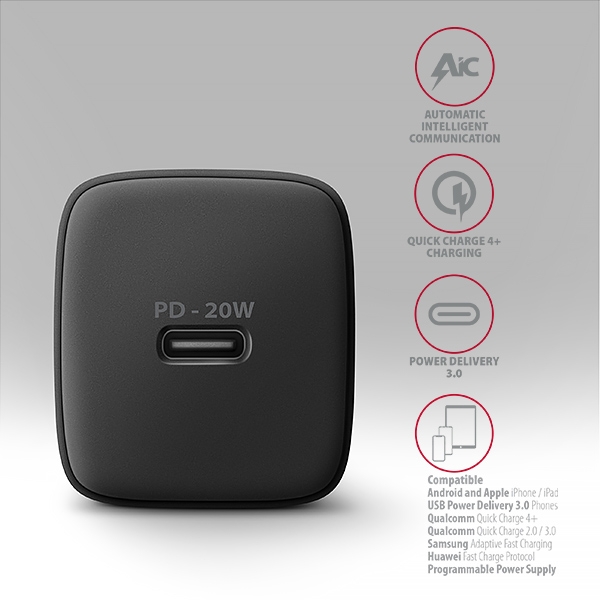 AXAGON ACU-PD20, nabíječka do sítě 20W, 1x port USB-C, PD3.0/PPS/QC4+/AFC/Apple, černá