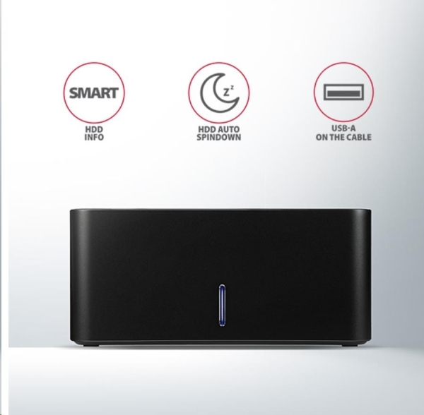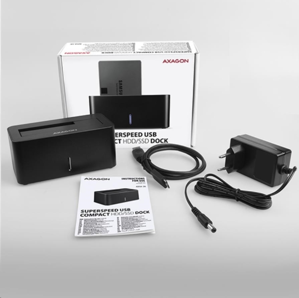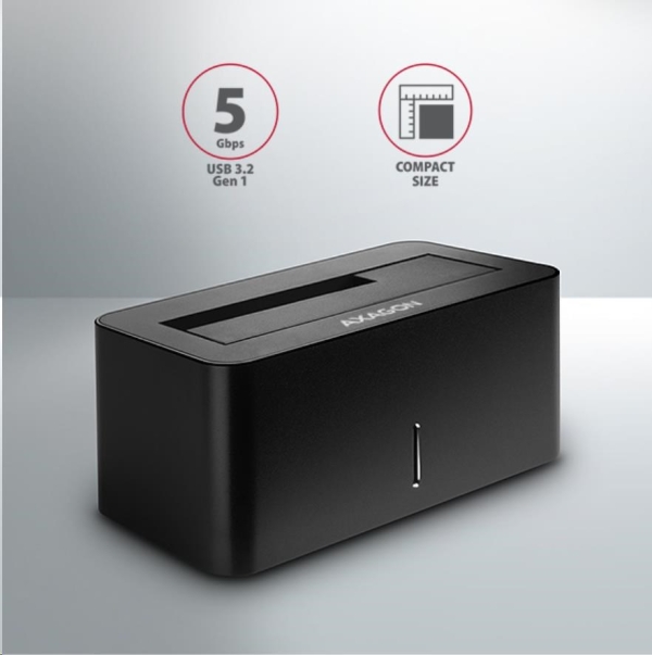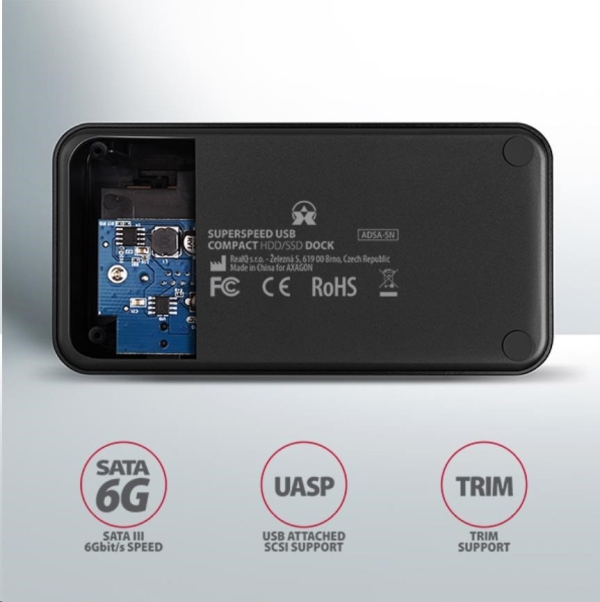 SuperSpeed USB dokovací stanice AXAGON ADSA-SN COMPACT HDD/SSD DOCK připojí k počítači snadno a rychle libovolný SATA disk. Šikovný pomocník pro nejjednodušší a nejrychlejší způsob připojení libovolných SATA disků k počítači - disk jen zasunete do základny. Automatickou instalaci stanice zvládne i úplný laik. Rozhraní SATA 6G s podporou UASP dovolí užívat si rychlost moderních SSD disků. Podpora funkce TRIM pro omezení pozvolné degradace výkonu SSD v čase. Čtení S.M.A.R.T. informací monitorujících kondici připojených disků. Podpora uspávání připojených disků i stanice. Nízko položené těžiště dokovací stanice pro dobrou stabilitu. Gumové nožky pro omezení vibrací. Moderní minimalistický design skříně s pláštěm z hliníku. Vstup: • USB 3.2 Gen 1 (USB 3.1 Gen 1 / USB 3.0) SuperSpeed USB s rychlostí až 5 Gbit/s. • Připojení přes micro USB type B female konektor. Podpora zařízení: • rozhraní SATA III - 6 Gb/s (600 MB/s), • podpora 2.5'' HDD/SSD, • podpora 3.5'' HDD, • max. kapacita disku - všechny bez omezení, • max. výška 2.5'' disku - všechny bez omezení. Další vlastnosti: • Kompatibilní s USB 3.2 Gen 1 / USB 3.1 Gen 1 / USB 3.0, zpětně kompatibilní s USB 2.0. • Podpora přenosových rychlostí 5000 / 480 Mbit/s (SuperSpeed / HighSpeed). • Vyhovuje Serial ATA 3.0 specifikaci (SATA/600), přenosové rychlosti až 6 Gb/s (600 MB/s). • Vyhovuje Serial ATA 2.0 specifikaci (SATA/300), přenosové rychlosti až 3 Gb/s (300 MB/s). • Vyhovuje Serial ATA 1.0 specifikaci (SATA/150), přenosové rychlosti až 1.5 Gb/s (150 MB/s). • Celková propustnost / přenosová rychlost boxu je dána použitým USB rozhraním (teor. 5 Gbit/s). • Podpora UASP (USB Attached SCSI Protocol) a BOT (Bulk-Only Transport). • Podpora bootování z SSD/HDD v dokovací stanici. • Možnost připojení zařízení za chodu díky podpoře Hot Plug. • Plná podpora Plug and Play. • HDD Auto Spindown - automatické uspání disku při nečinnosti trvající 15 minut. • HDD Turn Off - vypnutí disku po odebrání zařízení nebo uspání PC. • Kabel micro USB-B / USB-A délky 80 cm součástí balení. • Decentní modrá LED indikující připojení k USB portu počítače (trvalým svitem) a přenos dat (blikáním). • Vypínač napájení. • Napájení přes kompaktní externí AC/DC adapter 12V - 2A (24W) s přívodním kabelem délky 150 cm. • Rozměry stanice 130 x 65 x 59 mm. • Hmotnost 190 g. Podporované operační systémy: • MS Windows XP / Vista / 7 / 8 / 8.1 / 10 a novější, Windows Server 2003 / 2008 / 2012 / 2016 a novější (podporovány všechny 32- i 64-bitové verze OS Windows), Mac OS X 10.x a vyšší, Linux s jádrem 2.6.x a vyšším. Pozn.: Ovladače jsou součástí podporovaných operačních systémů a nainstalují se zcela automaticky. Žádné jiné ovladače není třeba instalovat a nejsou ani k dispozici. Balení v kartonové krabičce s přehledně uvedenými parametry: • USB 3.2 Gen 1 HDD dock, • micro USB-B - USB-A kabel délky 80 cm, • napájecí adapter 100-240V / 12V-2A, • multijazyčný manuál CZ/DE/DK/ENG/ESP/FIN/FR/GR/HR/HU/IT/NL/PL/PT/RO/RU/SK/SWE/BG/CN/TR/ARA.