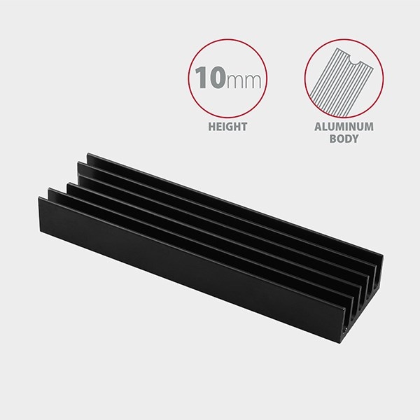Žebrovaný hliníkový chladič vysoký 10 mm napomáhá lepšímu odvodu tepla vzniklého při provozu M.2 SSD disku a umožňuje tak snížit teplotu disku až o 25 °C. Prodlužuje se tak životnost SSD disku a zamezí se zpomalování rychlosti disku tzv. „Thermal Throttling“.