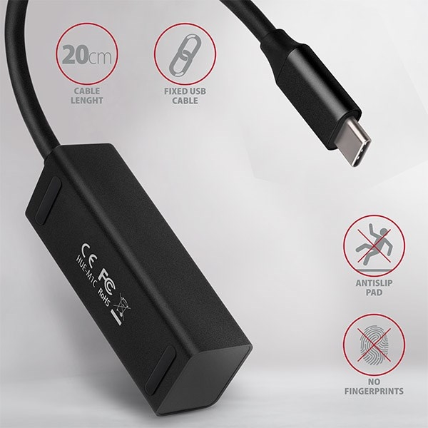 Miniaturní kovový USB-C 3.2 Gen 1 hub AXAGON HUE-M1C snadno a rychle připojí k notebooku nebo počítači až čtyři USB zařízení současně. Kovové tělo hubu je vyrobeno z hliníku a zajišťuje tak dokonalou mechanickou ochranu pro časté přenášení. Elegantní, jemně strukturovaný povrch brání nežádoucím otiskům. Gumové nožky zabraňují klouzání hubu po stole. Napevno uchycený USB kabel délky 20 cm je ideální pro uživatele mobilních zařízení.