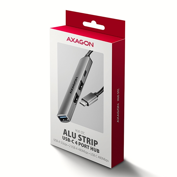 AXAGON HUE-STC, 4x USB ALU STRIP hub, 1x USB-A 5Gbps, 2x USB-A & 1x USB-C 480Mbps, kabel USB-C 12cm