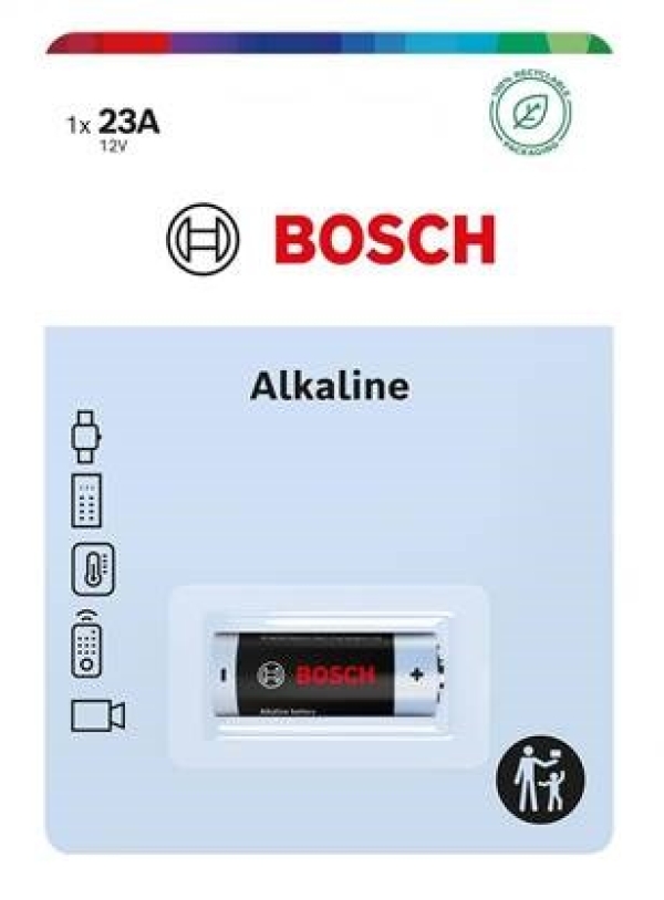 (BAL:1/20/160) Typ: 23A. Napětí: 12V. Alkalická baterie. Kvalitní baterie Bosch. Cena je uvedena za jeden kus. V balení na blistru 1ks.