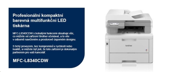 Profesionální kompaktní barevná multifunkční LED tiskárna Brother MFC-L8340CDW, která je ideální pro práci s formátem A4. Nabízí funkce, které splní očekávání v každé kanceláři. Toto zařízení je navrženo tak, aby bylo prostorově úsporné a zároveň nabízelo tichý provoz bez kompromisů v rychlosti nebo kvalitě tisku.