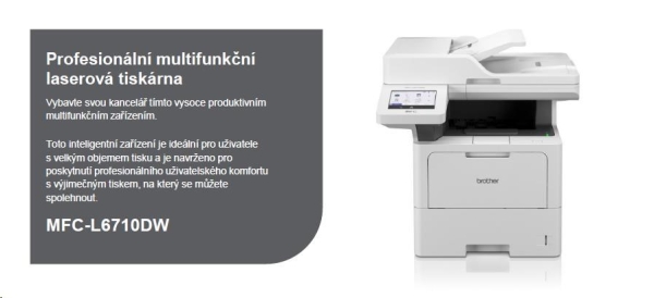 Brother MFC-L6710DW představuje multifunkční černobílou tiskárnu, která se hodí do jakéhokoli kancelářského prostředí. Tento model umožňuje tisknout, skenovat, kopírovat i faxovat dokumenty formátu A4. Při tisku poskytuje rozlišení až 1200 × 1200 DPI a dosahuje rychlosti až 50 stran za minutu, což zvyšuje produktivitu práce.