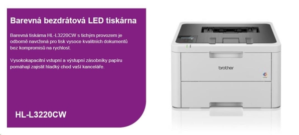 Barevná LED tiskárna Brother HL-L3220CW s bezdrátovým rozhraním je ideální pro rušné domácnosti a malé kanceláře, kde je potřeba rychlého a kvalitního barevného tisku. Díky LED technologii poskytuje tichý tisk bez kompromisů v kvalitě, což je výhodné pro pracovní prostředí, která vyžadují minimalizaci hluku. Tato tiskárna se snadno zapojí do vašeho pracovního prostředí a je kompatibilní s moderními technologiemi.