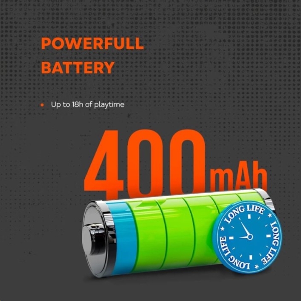 Baterie s kapacitou 400 mAh poskytuje úctyhodných 18 hodin přehrávání a plně se nabije za pouhé 2-3 hodiny prostřednictvím USB-C.