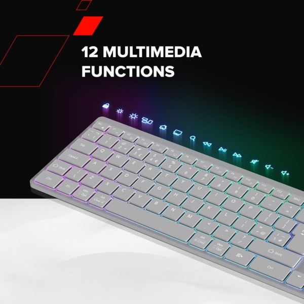 Klávesnice má 113 kláves s nůžkovým mechanismem, který zajišťuje tiché, plynulé a pohodlné psaní. RGB podsvícení v 7 barvách a osvětlení kláves vám umožní pracovat i ve tmě a zároveň dodá pracovnímu prostoru styl. Odolnost proti polití chrání klávesnici před drobnými nehodami a vestavěná 1600mAh baterie zajistí dlouhou výdrž bez nutnosti výměny baterií.