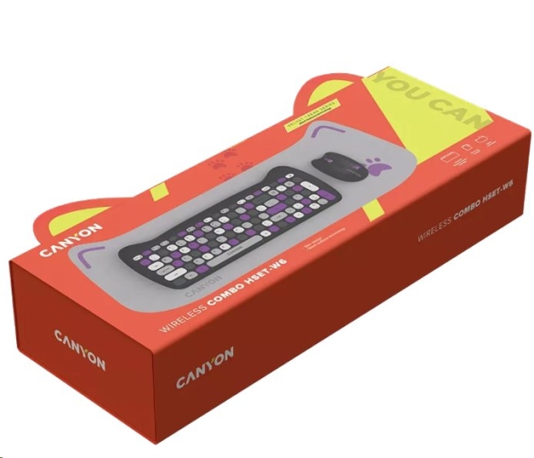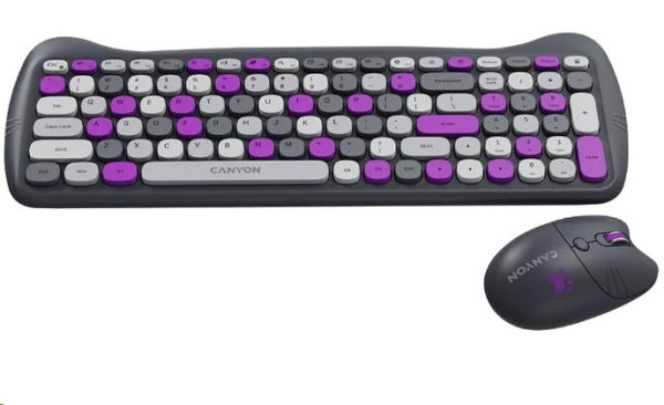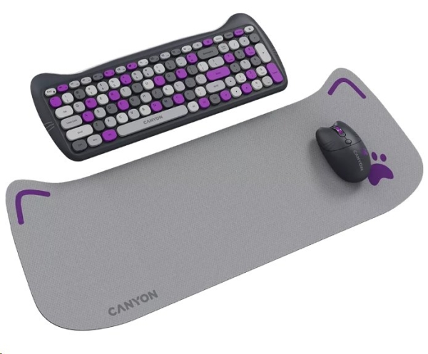 CANYON Kitty edice HSET-W6, bezdrátový SET CS klávesnice + optická myš + ochranné pouzdro + podložka, šedofialová