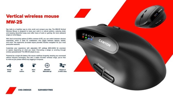 Objevte pohodlnější způsob práce i zábavy s vertikální bezdrátovou myší Canyon MW-25. Její ergonomický design podporuje přirozenou polohu ruky, čímž výrazně snižuje namáhání zápěstí a předloktí. Ideální volba pro každého, kdo tráví u počítače dlouhé hodiny – ať už v kanceláři, doma nebo na cestách.