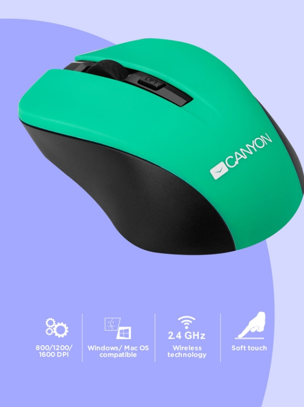 CANYON myš optická bezdrátová CMSW1, nastavitelné rozlišení 800/1000/1200 dpi, 4 tl, USB nano reciever, zelená