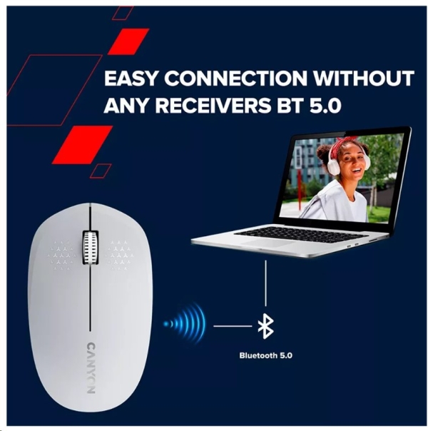Myš MW-04 od společnosti Canyon je univerzálním řešením na váš pracovní stůl. Díky Bluetooth 5.0 ji lze bez problémů připojit k nejrůznějším zařízením. Optický snímač s rozlišením 1200 DPI je kombinován s inteligentním systémem ú spory energie, který zajistí delší výdrž AA baterie. K dispozici jsou 3 minimalistická tlačítka, která mají životnost až 3 miliony kliknutí. Canyon MW-04 je lehká a kompaktní myš, takže nezabere moc místa a neváží skoro nic. Pokud jste leváci, nemusíte se bát: tato myš je symetrická a tudíž vhodná pro praváky i leváky.