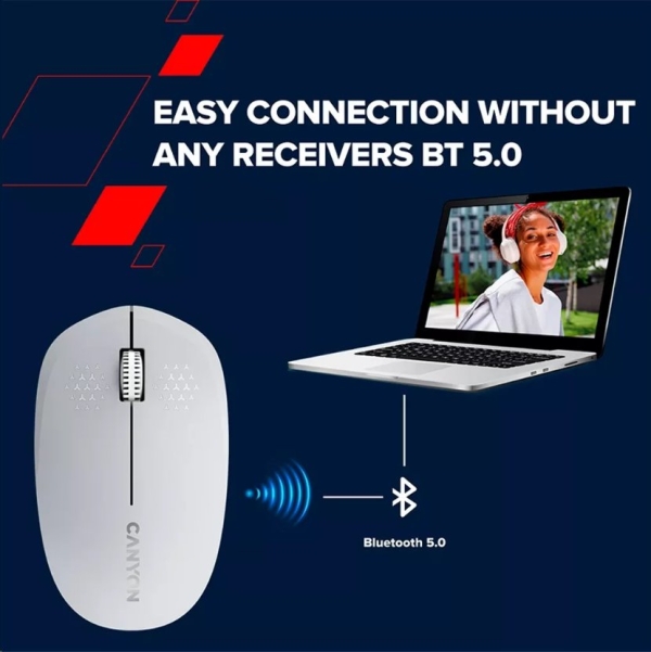 Myš MW-04 od společnosti Canyon je univerzálním řešením na váš pracovní stůl. Díky Bluetooth 5.0 ji lze bez problémů připojit k nejrůznějším zařízením. Optický snímač s rozlišením 1200 DPI je kombinován s inteligentním systémem ú spory energie, který zajistí delší výdrž AA baterie. K dispozici jsou 3 minimalistická tlačítka, která mají životnost až 3 miliony kliknutí. Canyon MW-04 je lehká a kompaktní myš, takže nezabere moc místa a neváží skoro nic. Pokud jste leváci, nemusíte se bát: tato myš je symetrická a tudíž vhodná pro praváky i leváky.