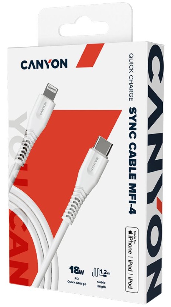 CANYON nabíjecí kabel Lightning MFI-4, USB-C Power delivery 18W, Apple certifikát, délka 1.2m, bílá