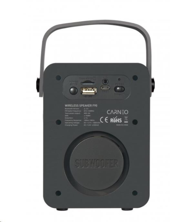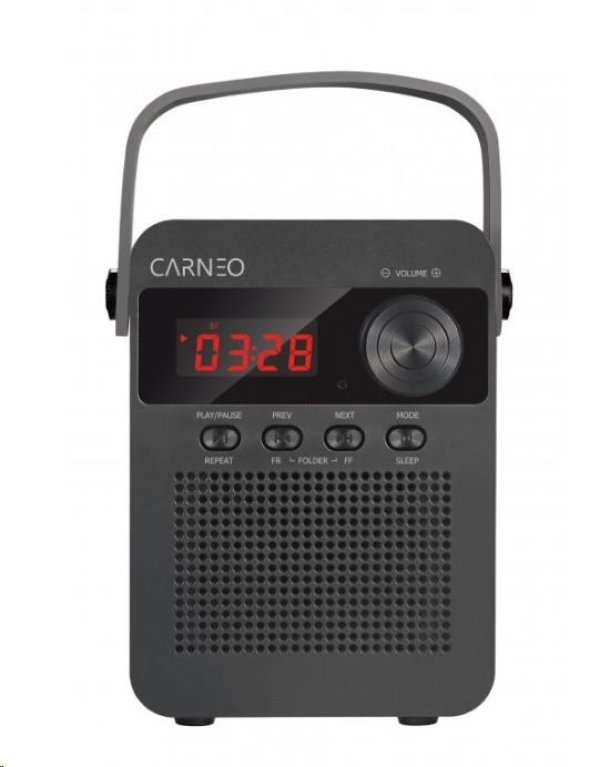 Rádio CARNEO FM F90 CARNEO F90 je kompaktní přenosné rádio s připojením Bluetooth a integrovanými porty USB a microSD, takže kromě rádia máte další možnost přehrávání hudby. Rádio má originální a kompaktní design a vejde se na noční stolek nebo na jakoukoli poličku. Díky vestavěné baterii jej můžete přenášet i mimo domov na zahradu nebo na večírek. K probuzení můžete použít 2 různá nastavení. Vysoce kvalitní FM tuner v rádiu nabízí až 40 možných předvoleb, vašich oblíbených rozhlasových stanic. Kromě klasických rozhlasových stanic můžete přehrávat svou oblíbenou hudbu ve formátu MP3 z karty micro SD nebo z vloženého disku USB. Další možností je připojení zdroje hudby z mobilního telefonu prostřednictvím konektoru 3,5 mm jack. Díky připojení Bluetooth můžete F90 připojit jako bezdrátový reproduktor s dobrou kvalitou poslechu díky dobrému výkonu i zadnímu subwooferu. Verze Bluetooth: 4.2 Výkon : RMS 5 W Baterie : LiIon 1800mAh (až 8 hodin) Rádio FM: (87,5 ~ 108 MHz) Digitální displej Přehrávání hudby: Bluetooth, USB, AUX, karta SD Subwoofer Vstup AUX Frekvence: 100 Hz - 20 kHz Rozměry: 95 x 130 x 60 mm Hmotnost: 250 g Balení: Rádio Kabel AUX Nabíjecí kabel USB
