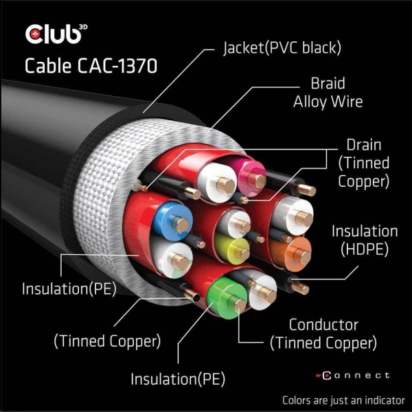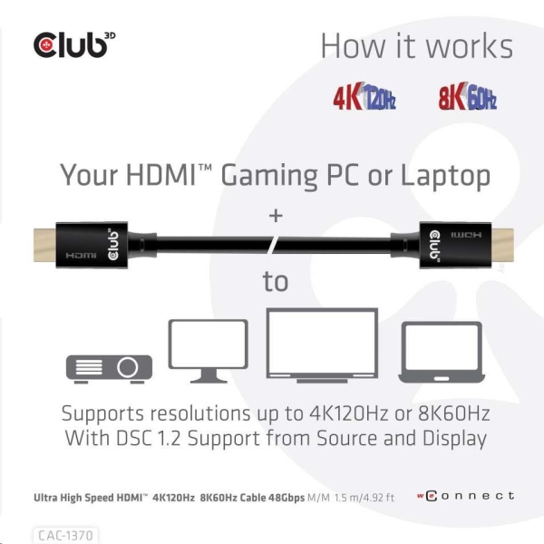 Club CAC-1370 3D Ultra High Speed HDMI™2.1 Certifikovaný kábel je skonštruovaný tak, aby zvládol najvyššiu kvalitu video- a audio- signálov.