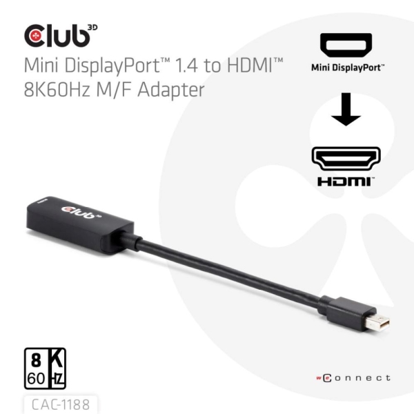 Club3D Adaptér miniDP 1.4 na HDMI, 4K120Hz nebo 8K60Hz HDR10+, M/F, 9cm