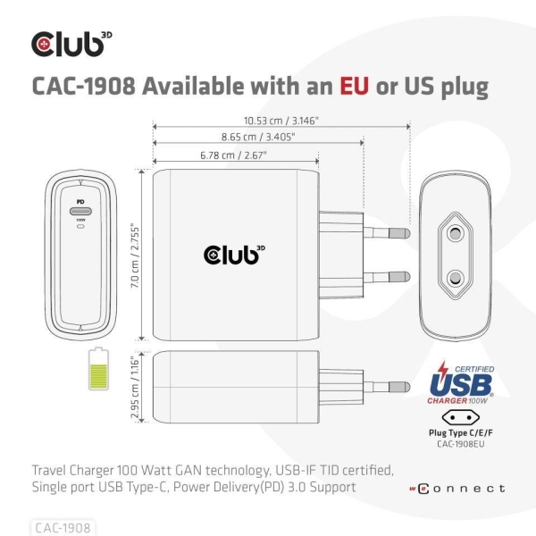 The Club3D CAC-1908 Travel Charger 100 Watt GAN technology, USB-IF TID certified, Single port USB Type-C, Power Delivery(PD) 3.0 Support is Compact in size & Superior in Performance: GAN technology chipset makes this charger 50% smaller than a traditional 100Watt Laptop chager, small enough to carry anywhere. Our CAC-1908 100Watt wall charger match a variety of PD devices from smart phones to laptops, one for all making charging simple. This wide compatibility charger will be your convenient companion during your business trip or vacation.