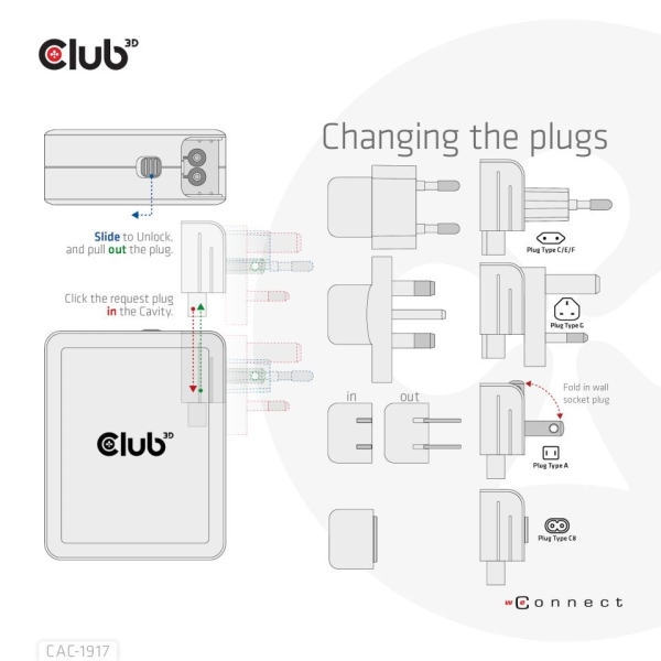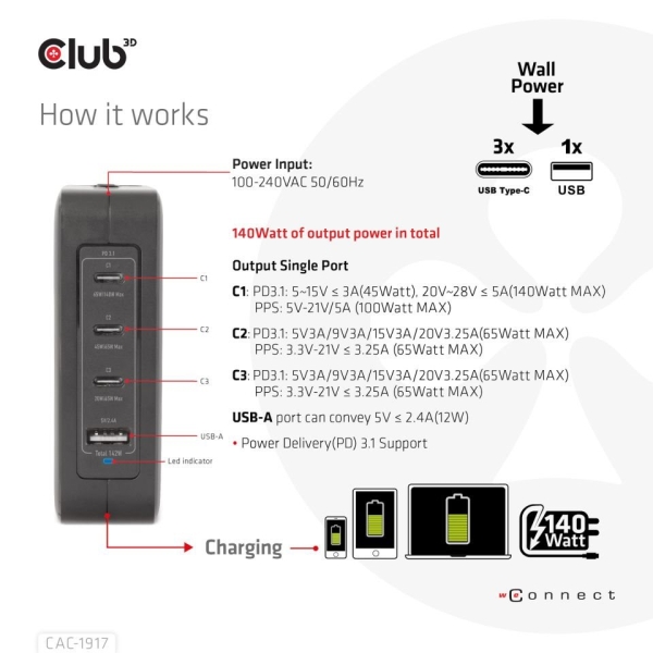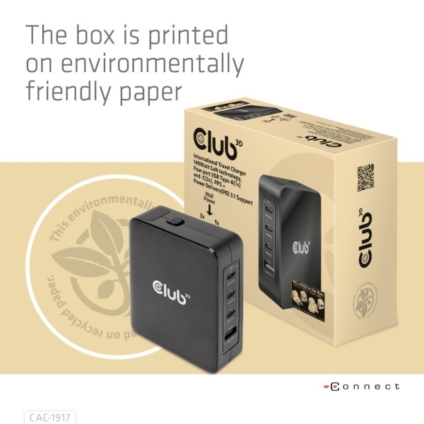 Mezinárodní cestovní nabíječka Club 3D CAC-1917 140W GaN technologie, 4 porty USB Type-A (1x) a -C (3x), podpora PPS + Power Delivery (PD) 3.1 je vysoce výkonná cestovní nabíječka s módním designem.