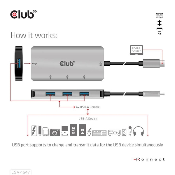Club 3D CSV-1547 je rozbočovač USB Gen2 typu C na štyri porty USB typu A, ktorý pridáva štyri bežné porty USB typu A k vášmu zariadeniu s rozhraním USB typu C 10G na prenos dát a nabíjanie. Môže fungovať na akomkoľvek hostiteľovi typu C (PC, notebook, tablet, mobilný telefón atď.). Funguje so všetkými hlavnými operačnými systémami.